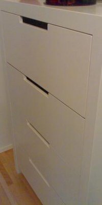 Valkoinen eteisen kenkäkaappi, jossa alaspäin kääntyvät kenkälaatikot.