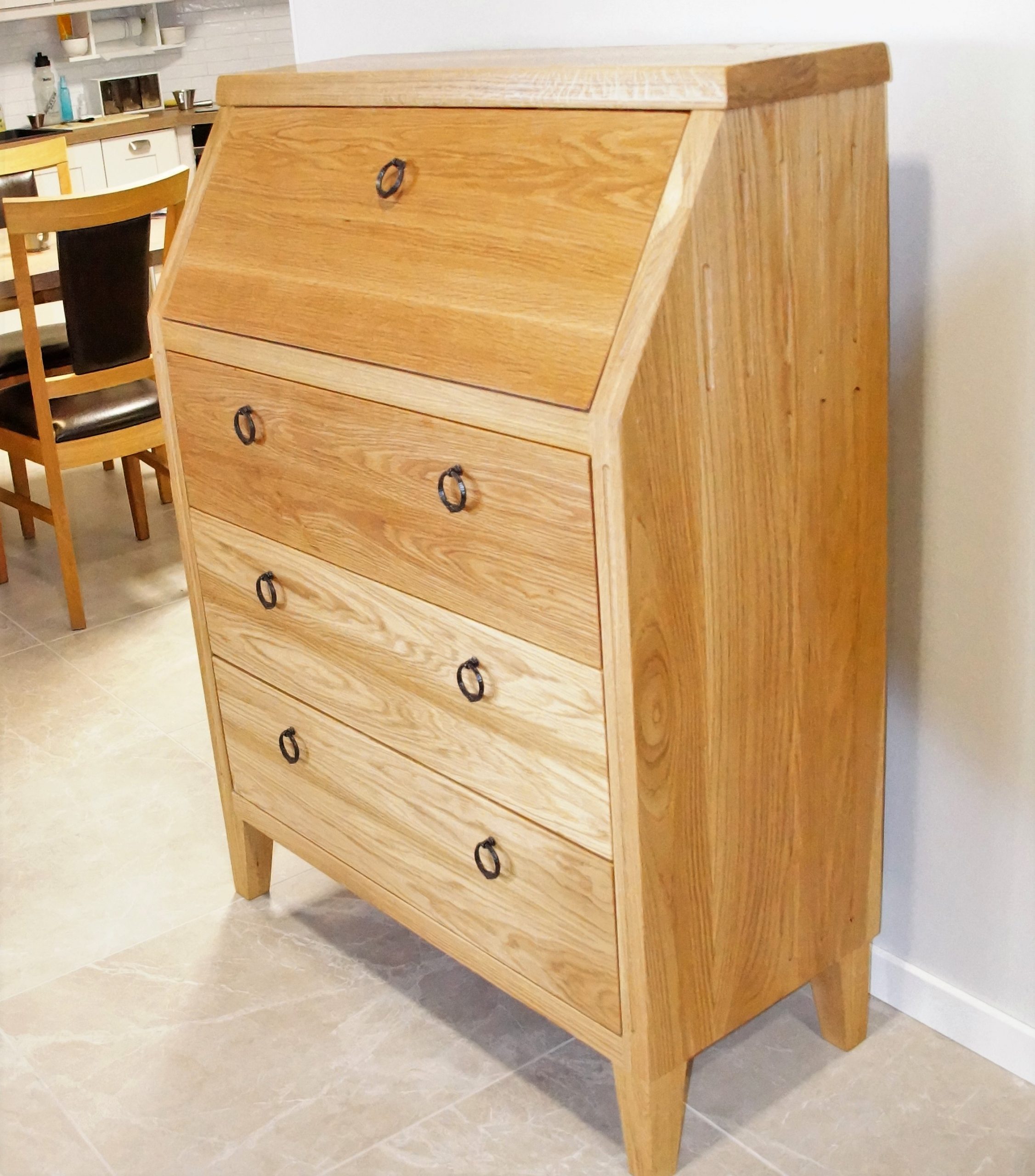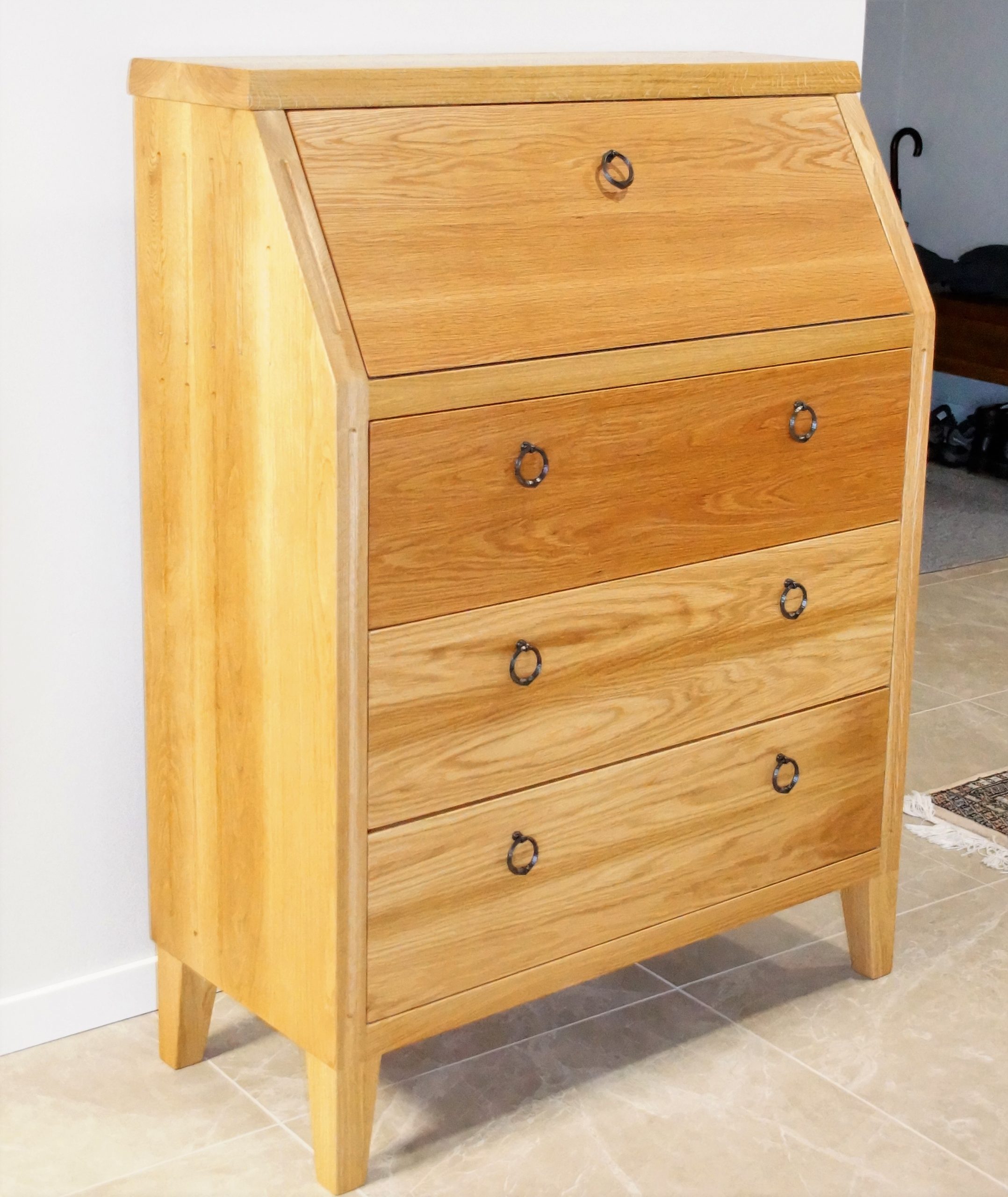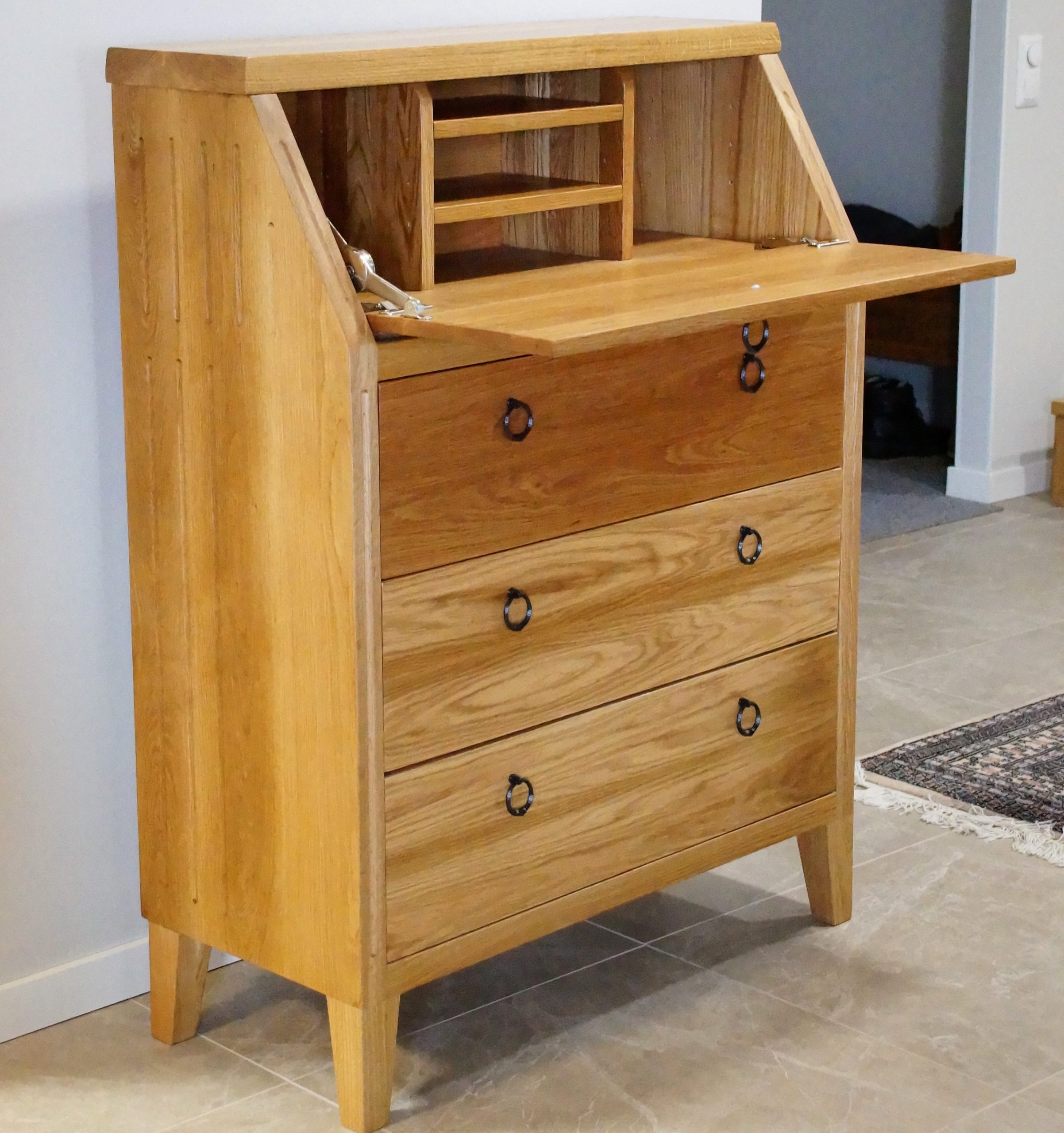 Vanhan ajan kirjoituspöytä aukeavalla kannella. Tämä yksilö suunniteltiin eteiseen, juoksevien asioiden hoitoon ja oleellisten tavaroiden säilytykseen.