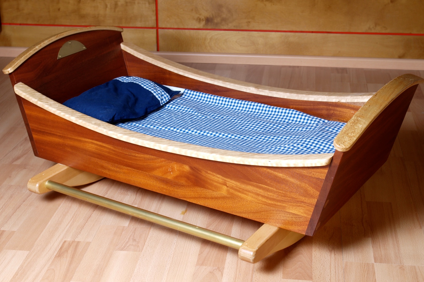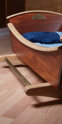 Perinteistä modernimpi kehto. Materiaaleina käytetty mahonkia, loimu- ja visakoivua sekä messinkiä.
