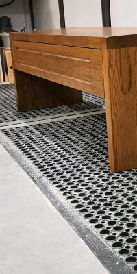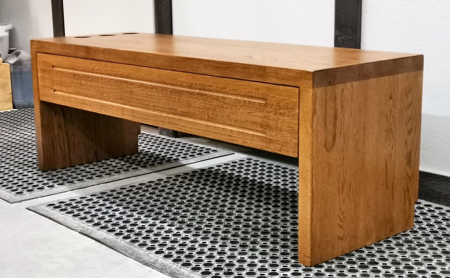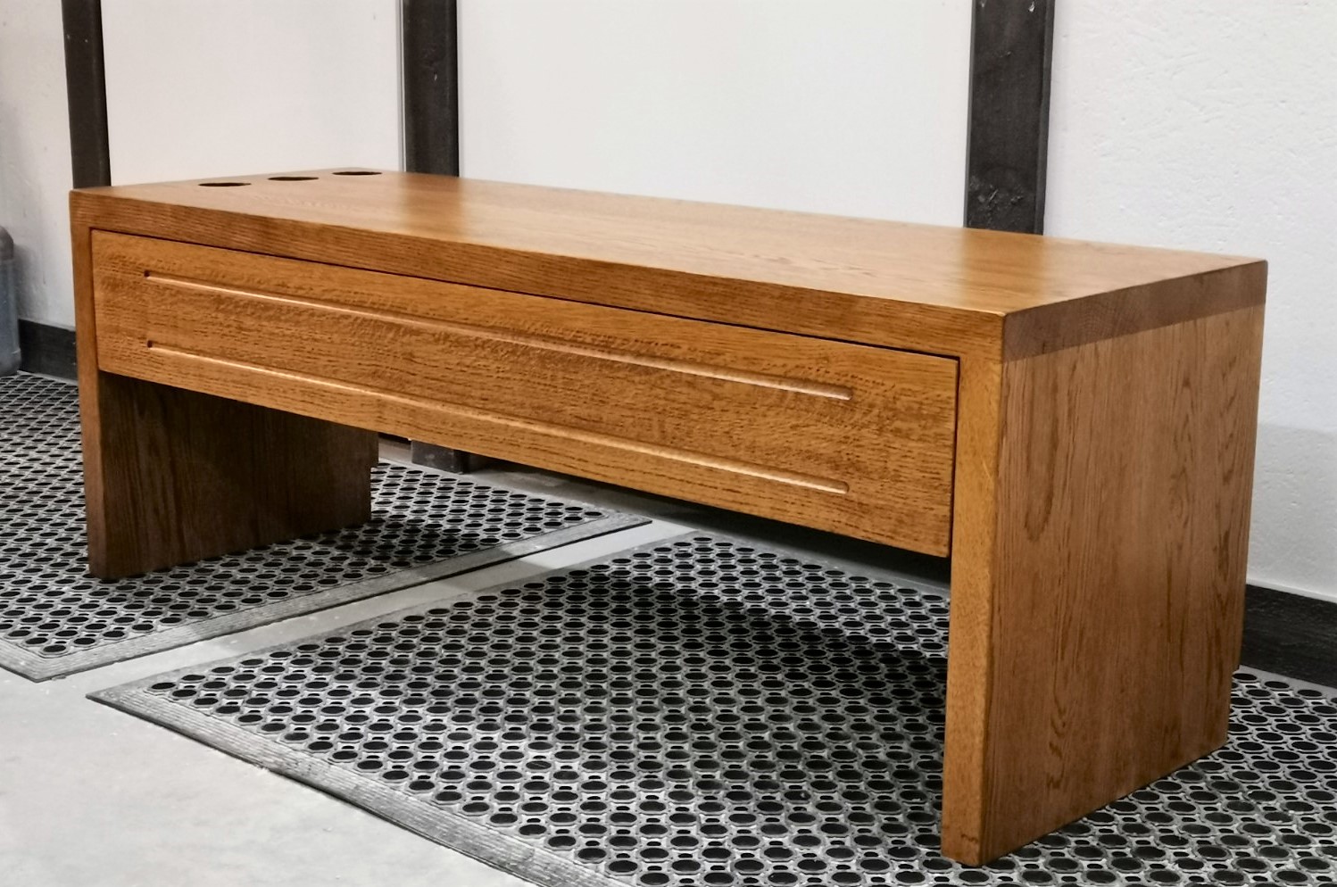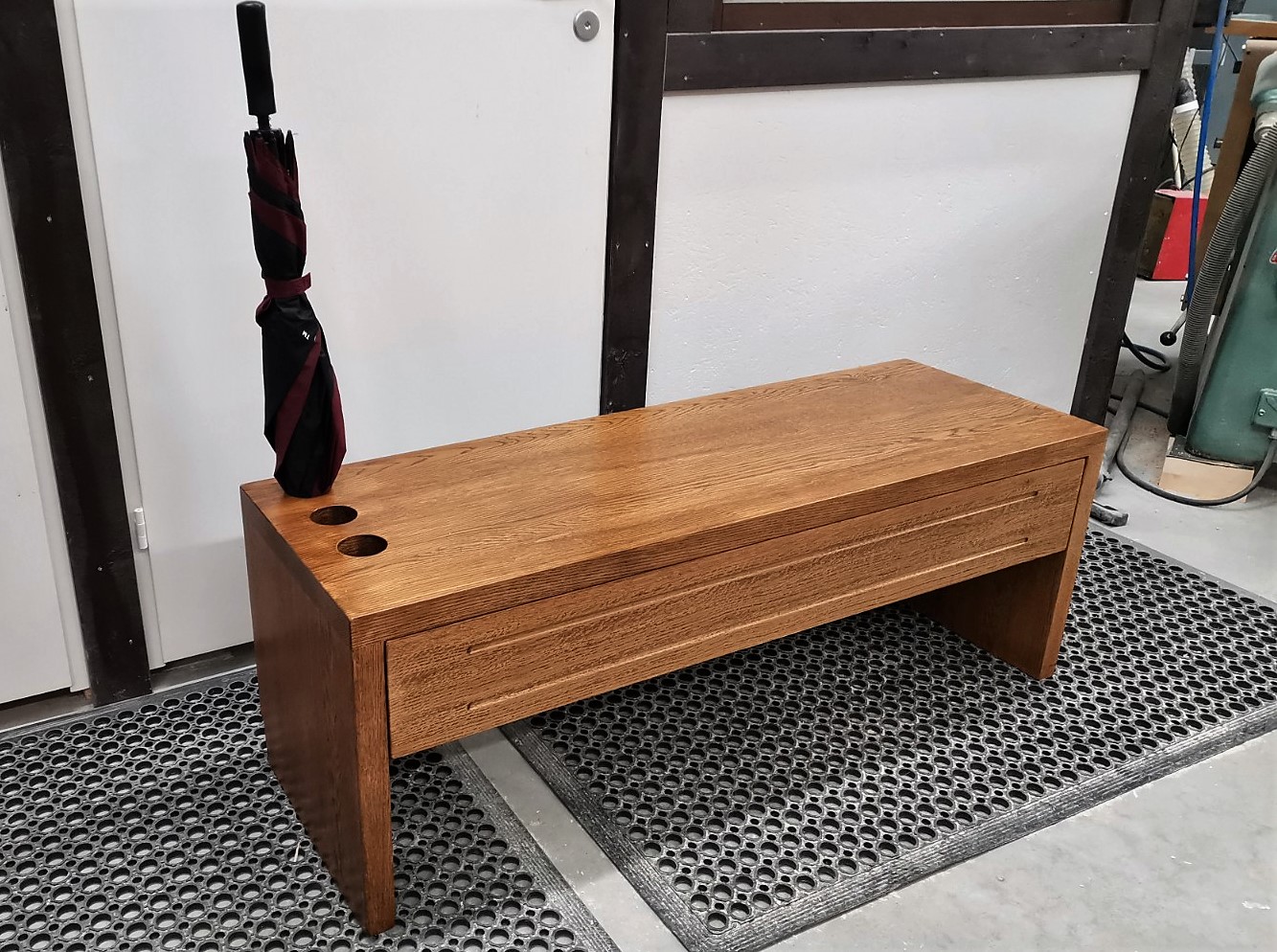 Eteisen penkki säilytyslaatikolla ja integroidulla sateenvarjojen pidikkeillä. Tammea on sävytetty hieman tummemmaksi.