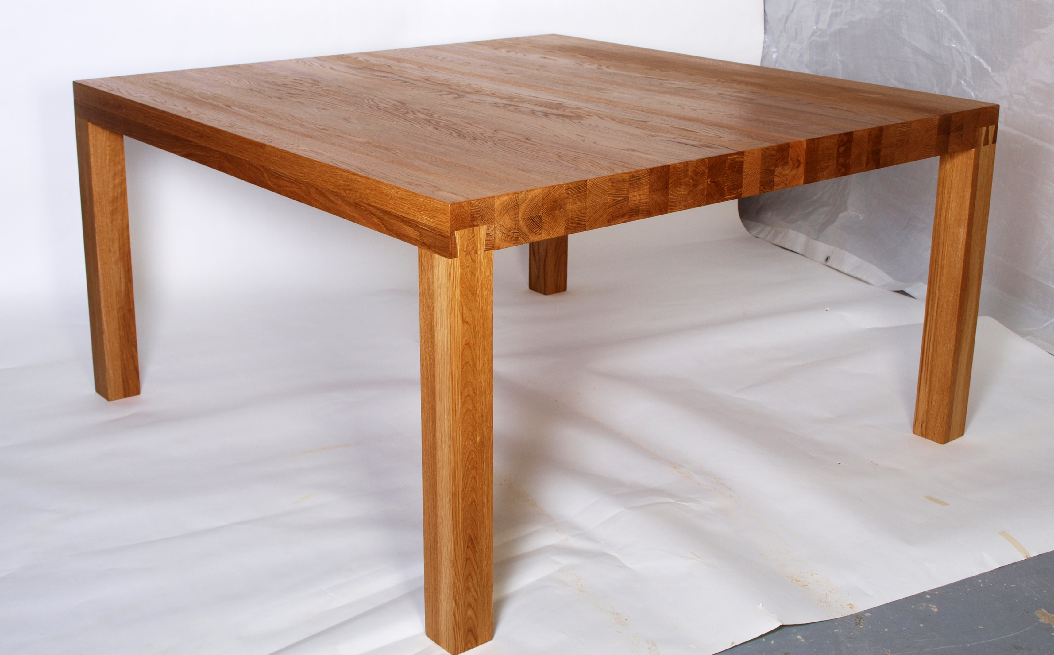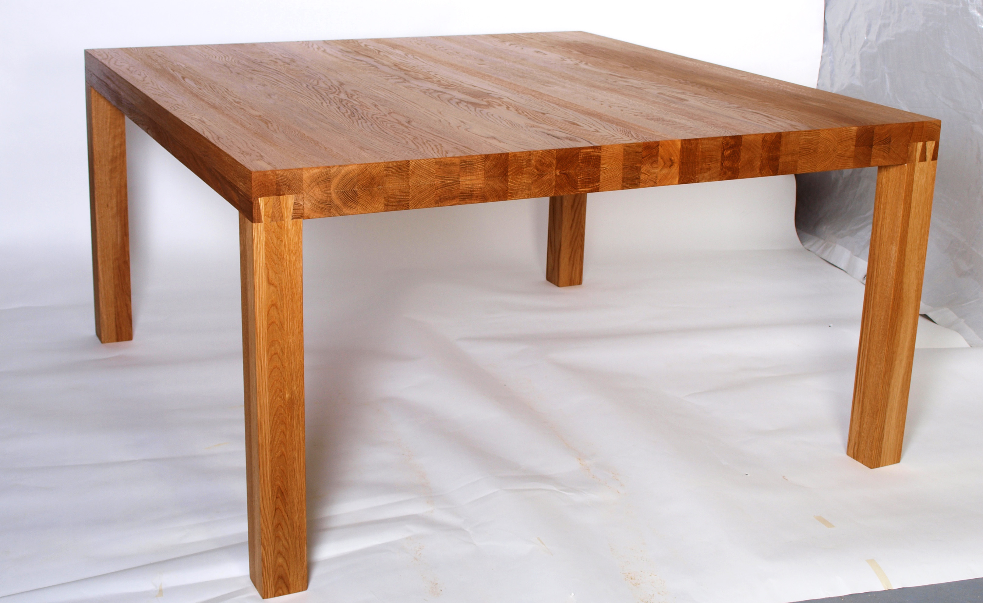 Neliön muotoinen tammesta valmistettu pöytä sinkkaliitoksin. Pintakäsittelynä öljyvaha.