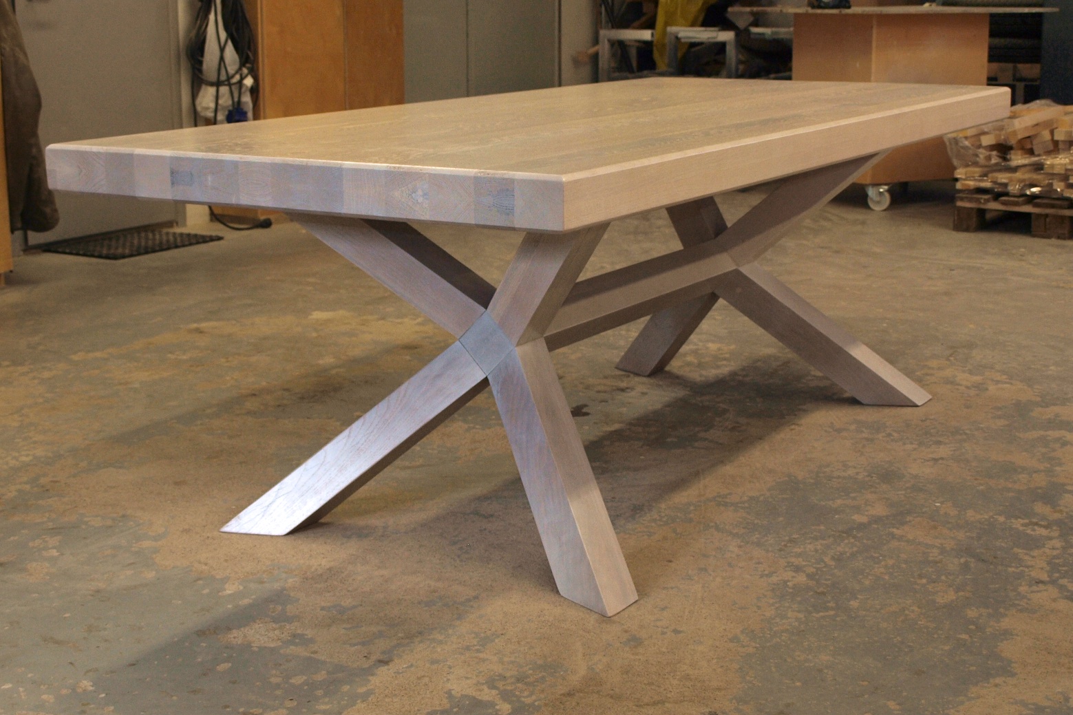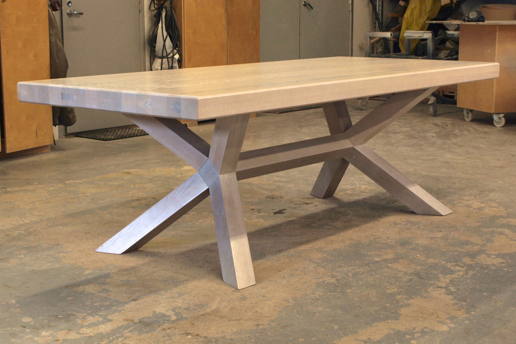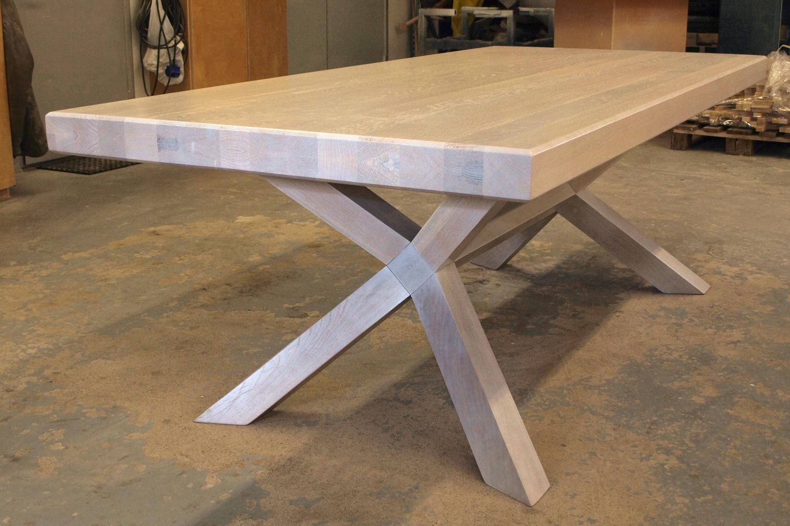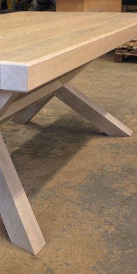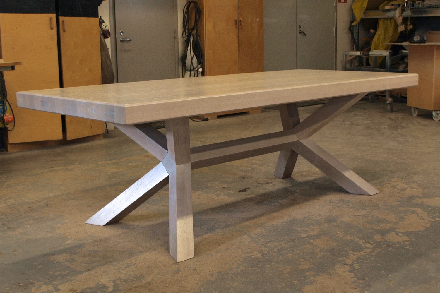 Valkolakattu tamminen ruokapöytä. Asiakas esitti idean jalkamallista ja toteutus kuvan mukainen. Voidaan toteuttaa myös ohuemmalla kannella.