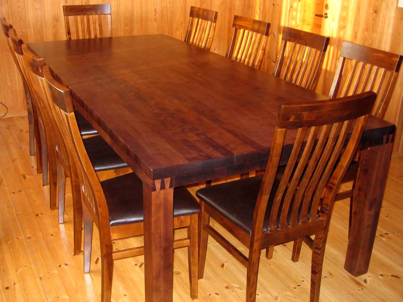 Massiivikoivuinen pöytä 240cm x 110cm. Neljä tuolia menee väljästi sivulleen ja leveys sallii ruokakattauksen tekemisen keskelle. Aamupalapöydässä useampi lukee lehtensä rauhassa.