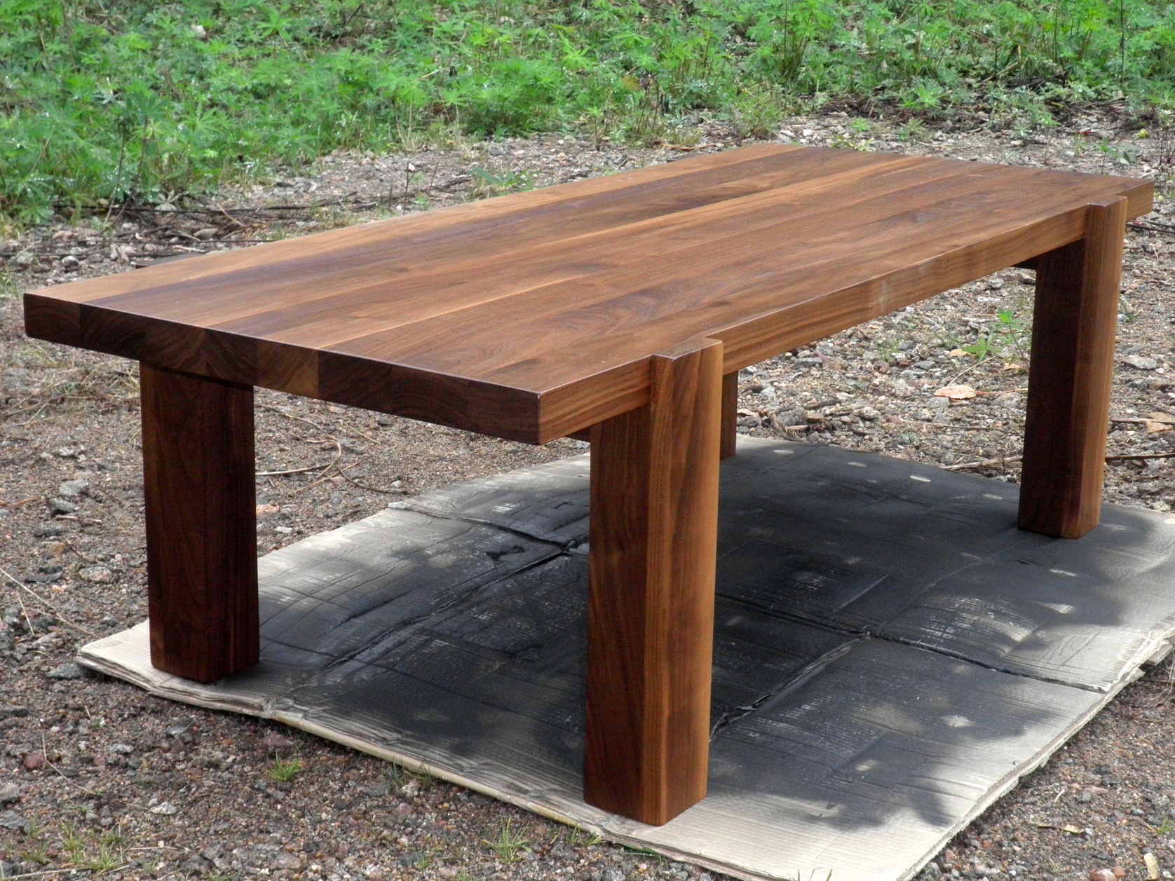 Tukevalla designilla oleva pähkinäpuinen sohvapöytä. Asiakas antoi hahmotelman mallista ja toimiva se olikin.