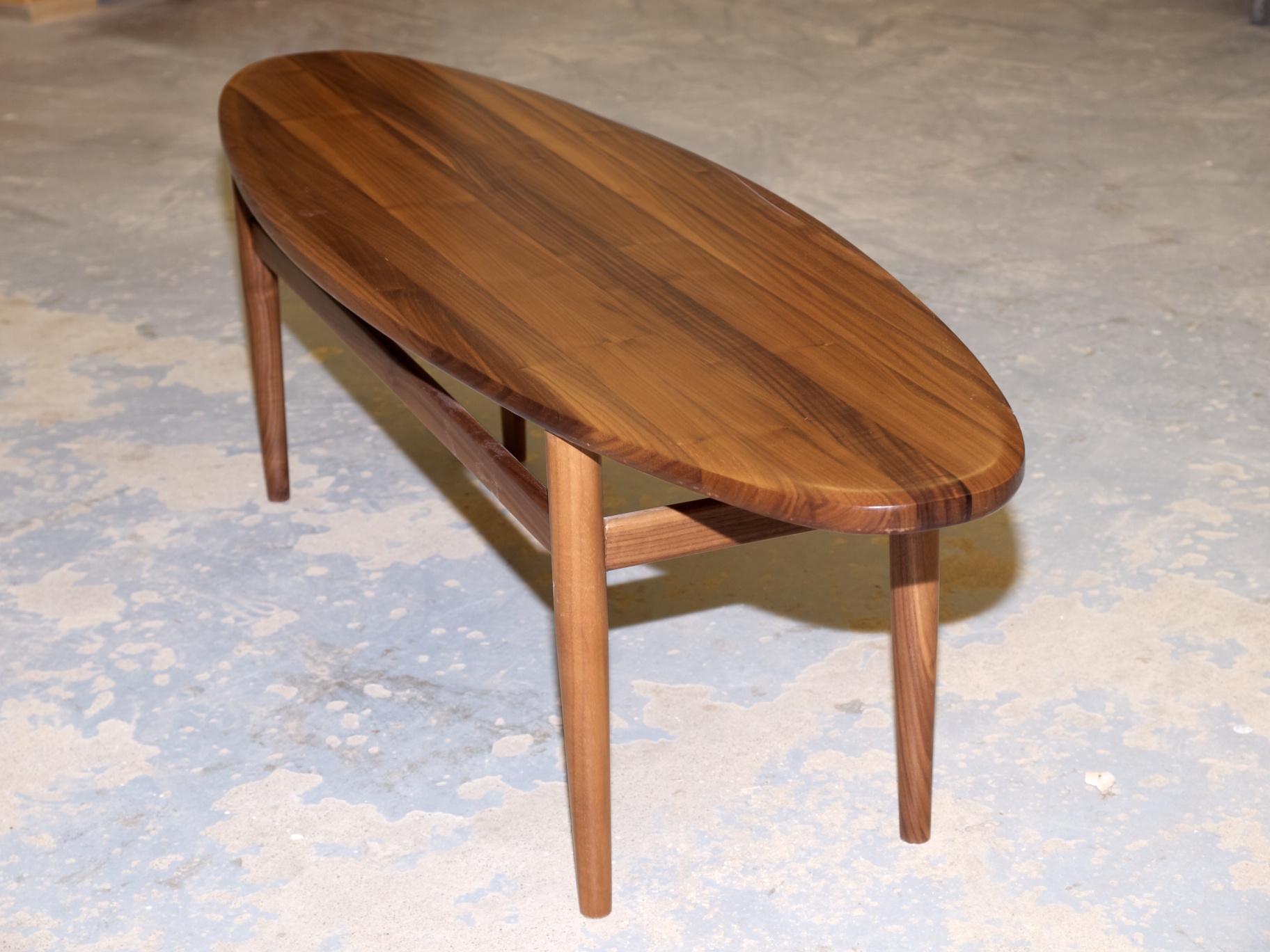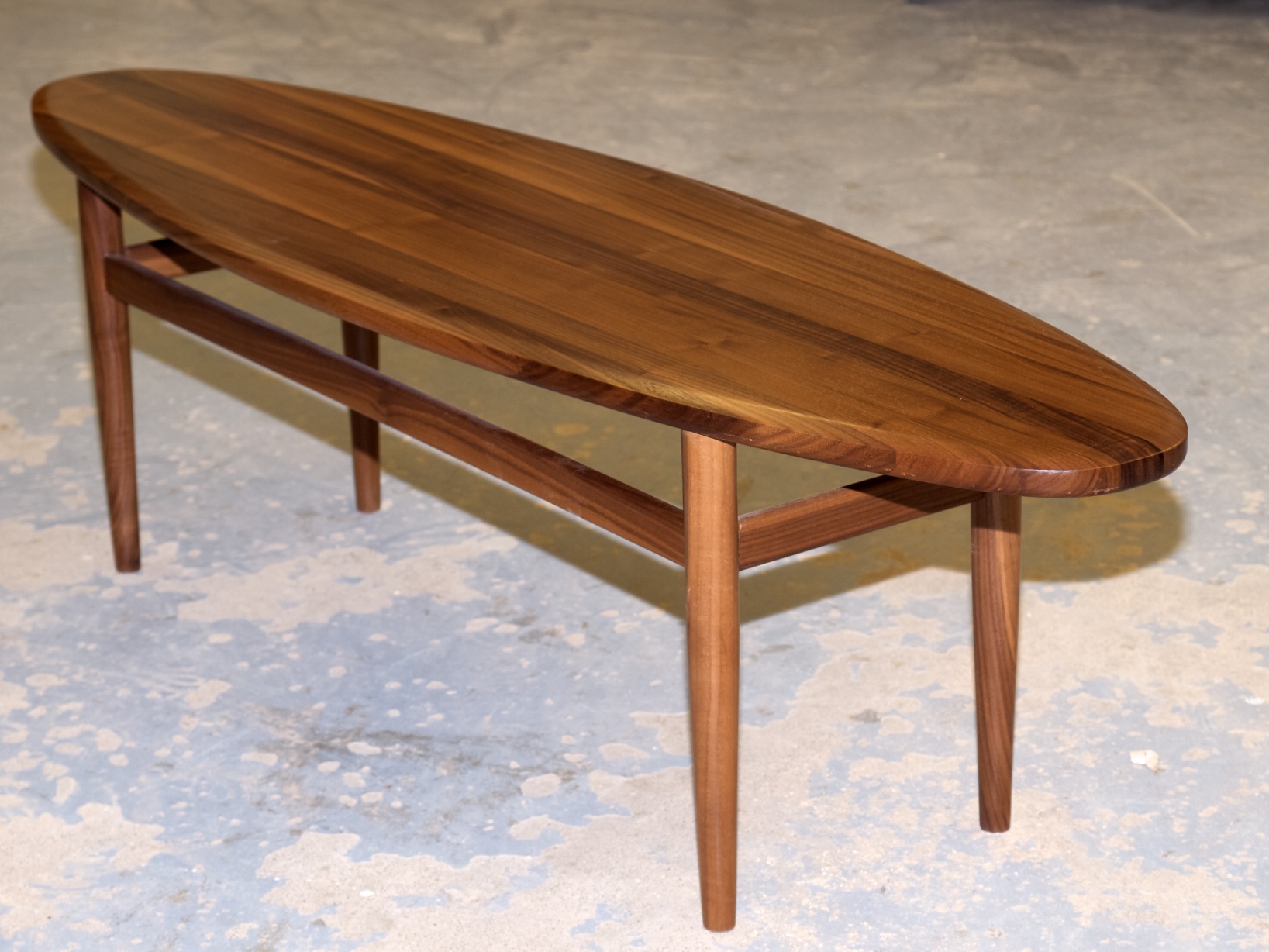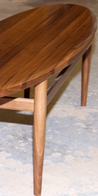 Sirommalla, mutta sitäkin tyylikkäämmällä mallilla tehty sohvapöytä. Kapea ja pitkä malli on todella linjakas. Pähkinäpuuta.