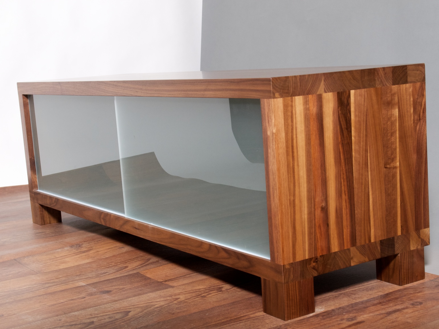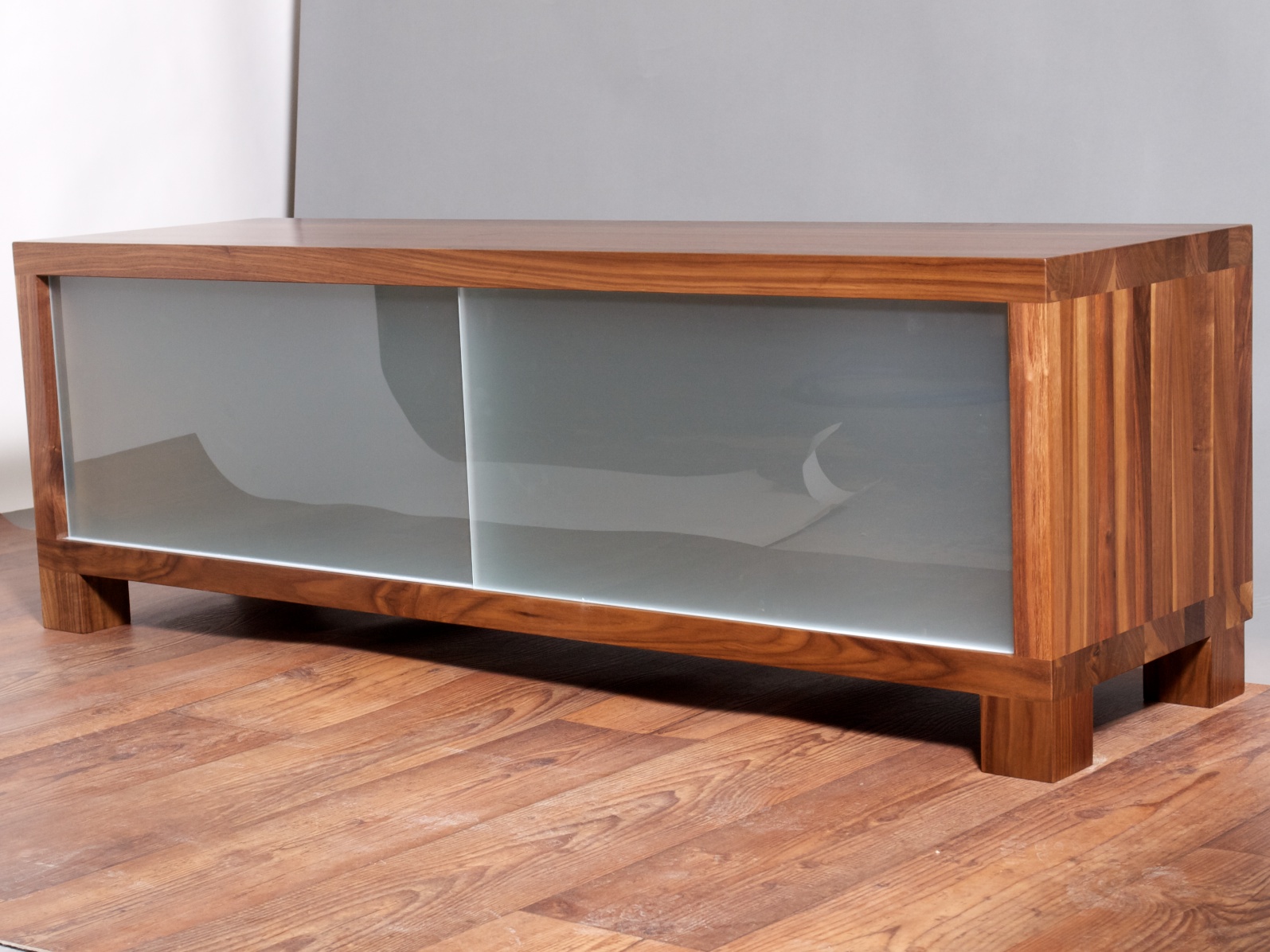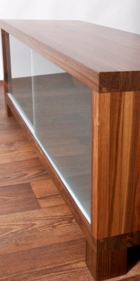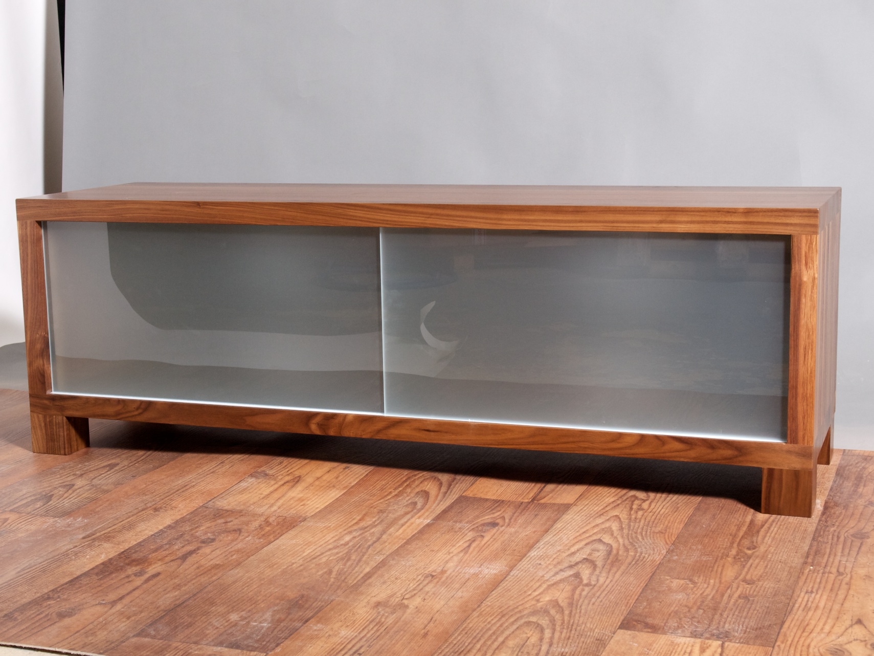 Pähkinäpuu tekee tästä tasosta todella näyttävän. Kun on kunnon raaka-aineet, niin design voi olla yksinkertainen. Muoviurassa olevat etsatut lasit liukuvat niin kevyesti, etteivät ne vetimiä kaipaa.