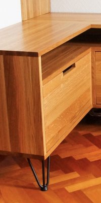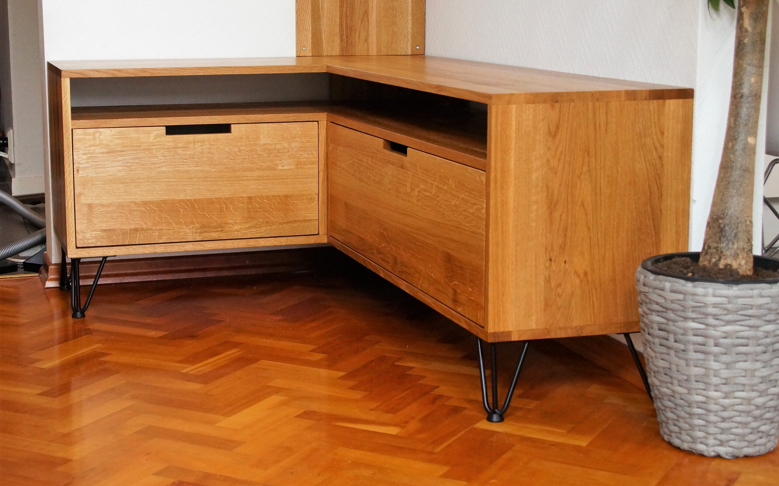 Nurkkaratkaisuna toteutettu tv-taso. Taso suunniteltiin asiakkaan laitteiden ja keskikaiuttimen mukaan. Johtoviennit ja tason takana olevat pistorasiat huomioiden.