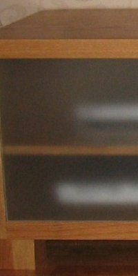 Tamminen tv-taso etsatuilla lasiovilla. Keskellä laatikot joiden eteen ovet avattaessa liukuvat.