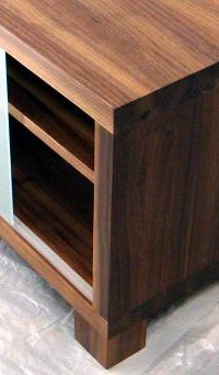 Pähkinäpuisessa tv-tasossa on etsatut liukuvat lasiovet. Kaukosäädin signaali menee ovien läpi, jolloin kaikki laitteet saadaan kätevästi piiloon. Ovet eivät vetimiä kaipaa sillä ne liikkuvat niitä herkästi liuttamalla. Mitat: 130x50x45
